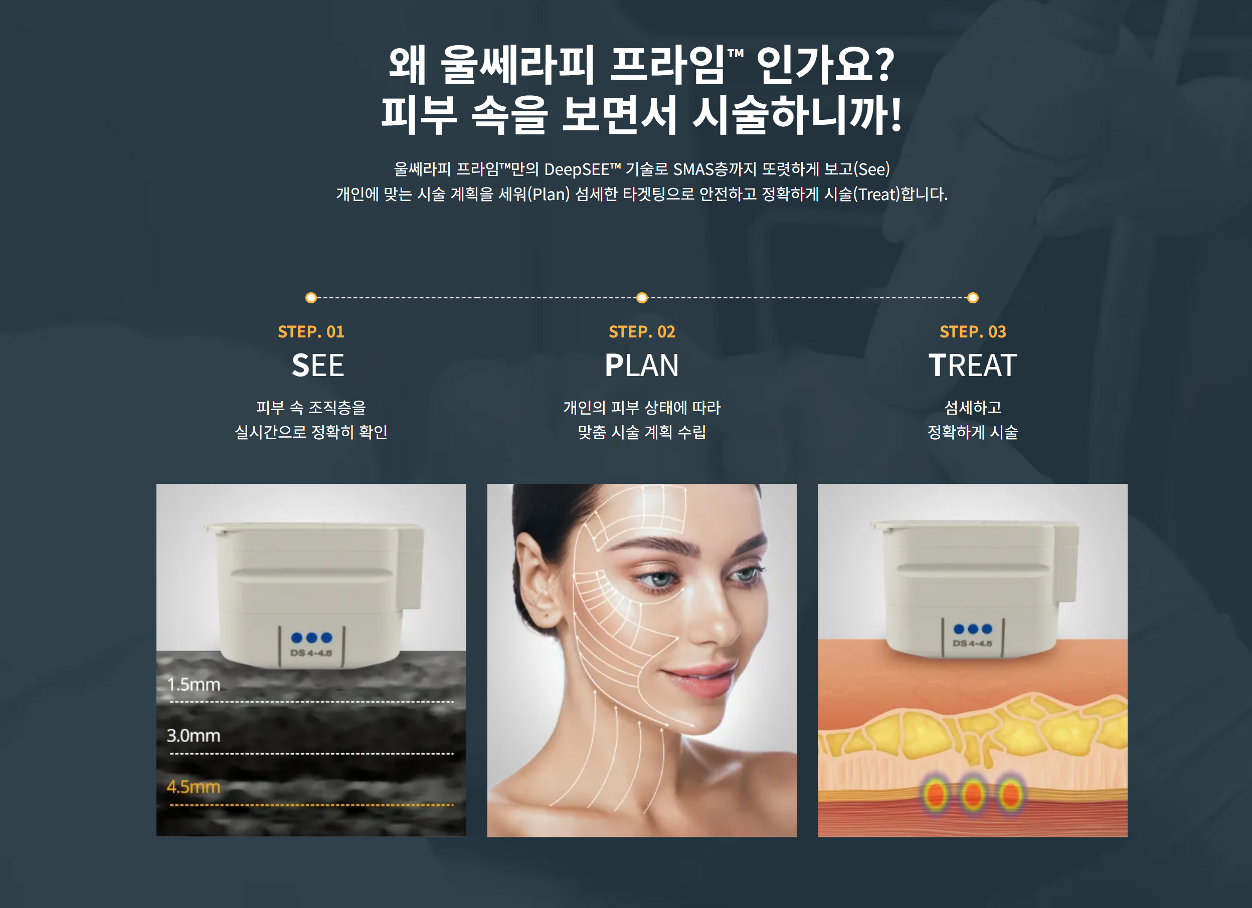많은 분이 리프팅 시술을 단순히 ‘에너지를 쏘는 과정’이라고 생각하십니다. 하지만 사람의 얼굴은 모두 다릅니다. 피부의 두께, 지방층의 분포, 근막층의 깊이는 개인마다, 심지어는 한 사람의 얼굴 내에서도 부위별로 천차만별입니다. 울쎄라피 프라임이 현존하는 리프팅 장비 중에서도 독보적인 위치를 차지하는 이유는 바로 시술자가 환자의 피부 속 구조를 실시간으로 확인할 수 있는 ‘DeepSee™' 영상 장치 때문입니다.